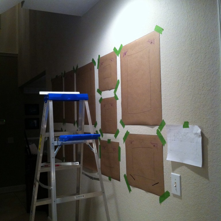 Like I said, I was determined to hang this in the new house so I had to find a way to create my own template. I picked up a roll of brown paper from the Home Depot (the girls and I made it a #CampRoemer adventure!) and traced each frame with a sharpie on the paper. I then cut each one out, as accurately as I could and after, I flipped the frame over, placed the cut paper on top and rubbed a crayon on the nifty, little hangers on the frame. This way after I taped them on the wall, I would know where to drill the holes.